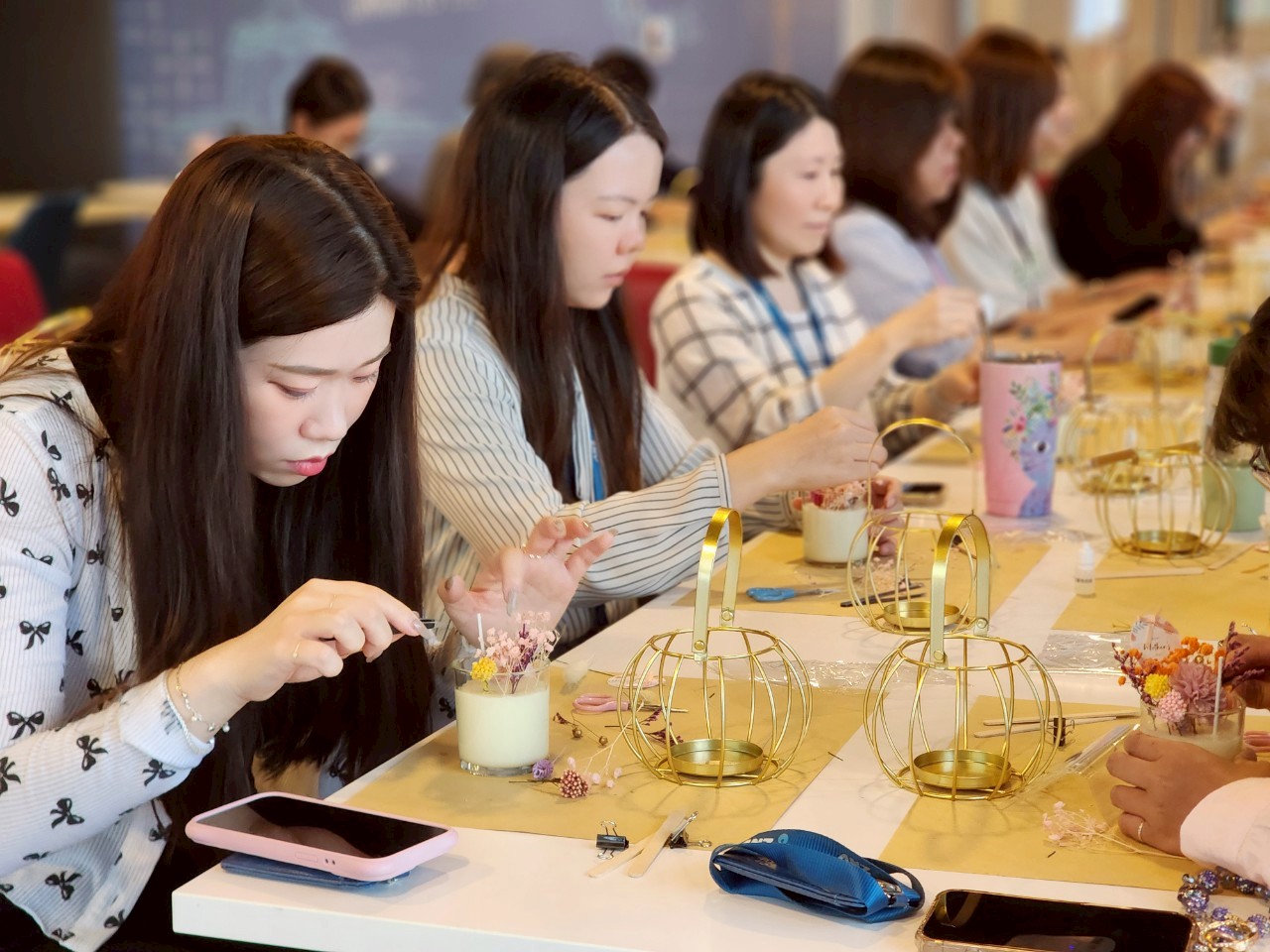 南瓜鐵藝香氛蠟燭課程是企業外派課程的熱門選項,透明玻璃杯搭配金質的南瓜提籠特別有質感,在課程設計上,選用的搭配花材為主花和雪蓮,為了襯托出金質提籠的高級感,南瓜鐵藝香氛蠟燭的設計會以小巧精緻為主,往往課程結束許多人都捨不得燒,想要放在家裡最顯眼的地方當擺飾!這堂課可以選擇是老師教學,平板教學或是企業外派唷。