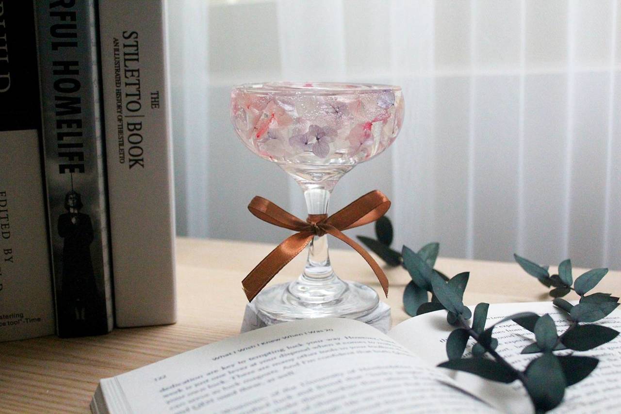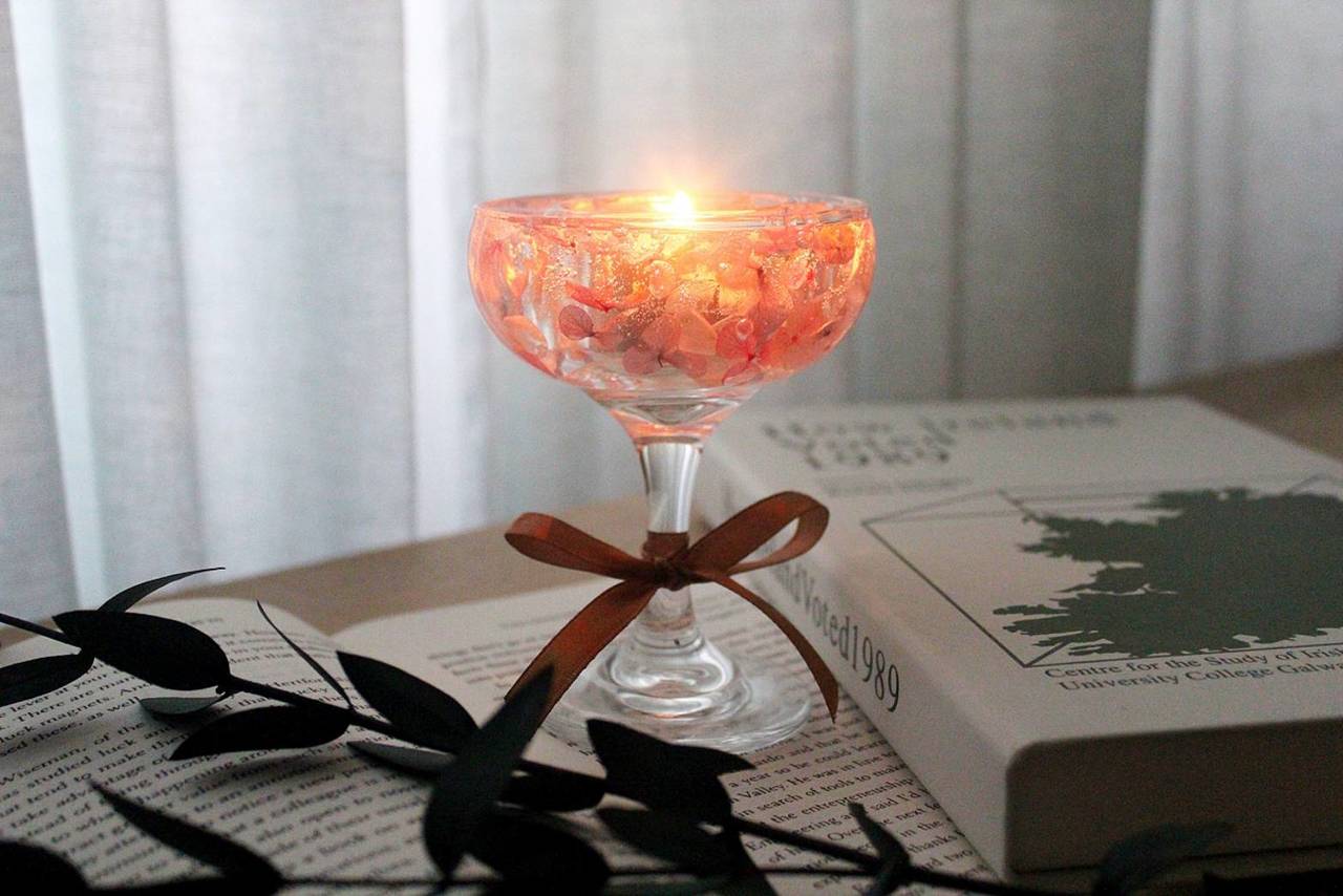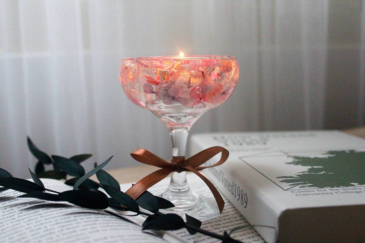 永生繡球花玻璃杯燭台透過高腳杯的造型,與果凍蠟的結合,挑選你想要的永生繡球花的顏色,將小茶蠟擺置其中,燭火光影透過花瓣的顏色折射出來,讓你們家變得有氣氛與美麗!此平板課程結束後會贈送兩顆小茶蠟唷!